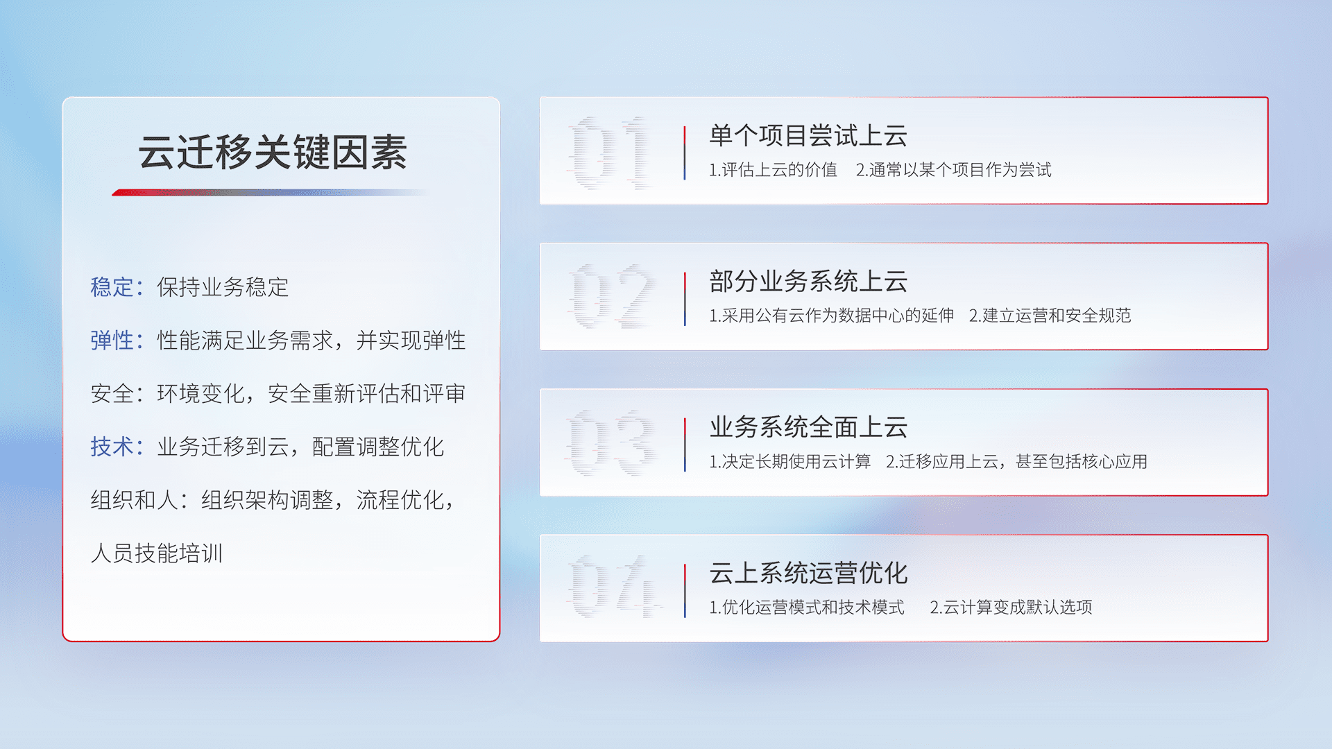 结合实际业务,,从规划设计、、云平台选型、、、云原生改造、、、数据迁移、、集成交付,,,,迁移全过程为客户识别最佳上云路径,,做好风险识别管理,,设计网络架构、、身份权限、、、、安全审计合规、、、操作审计、、日志审计、、监控告警策略、、、、多站点容灾设计等,,,,对云上基础设施进行整体规划,,,,提升IT治理水平,,以满足弹性、、高可用、、高性能的需求。。。