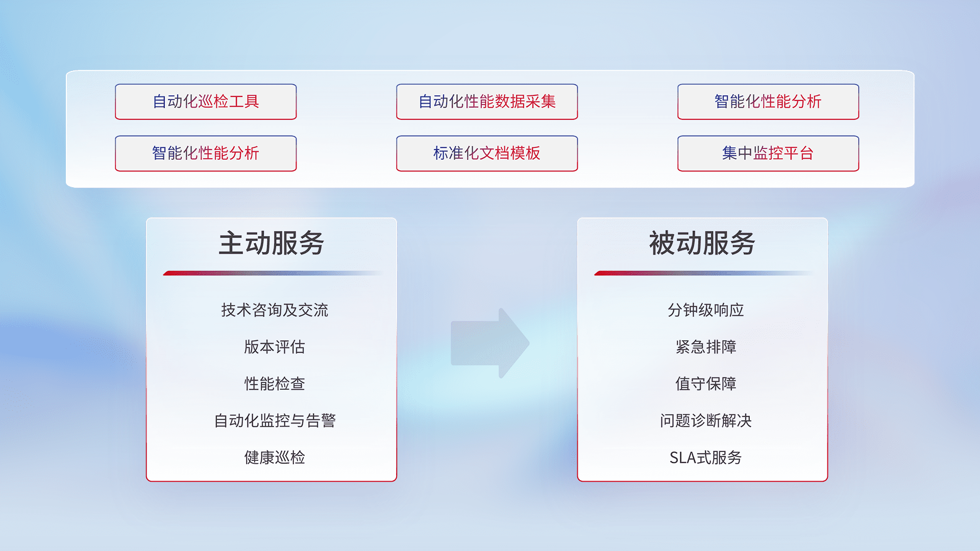 智能化工具和标准化文档,,,保障服务质量,,,,提供主动服务(包含技术咨询、、版本评估、、性能检查、、、、自动化监控与告警、、、健康巡检)和被动服务包含(分钟级响应、、、、紧急排障、、值守保障、、问题诊断解决、、、SLA服务)。。。